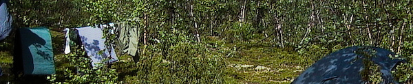 17:45: Leirissä Pöyrisjoen varrella. Oli hieman hankala päivä, maasto vaikeampaa ja jalat vaivasivat hieman, joten päätimme jäädä jo tähän, ettei homma muuttuisi väkinäiseksi heti alkumatkasta. Ei näiden reissujen tarkoitus ole olla urheilusuorituksia, vaan päivämatkoihin on varattava tarpeeksi aikaa. Huonoa omaatuntuntoa ei tarvitse tuntea vaikka joskus etenisi vain parikin kilometria tai pitäisi jopa luppopäivän. Yleensä pyrimme siirtymaan ainakin jonkin verran myös lepopäivinä, ihan vaan vaihtelun vuoksi, ellei nyt sitten satu erityisen mieleinen asentopaikka.